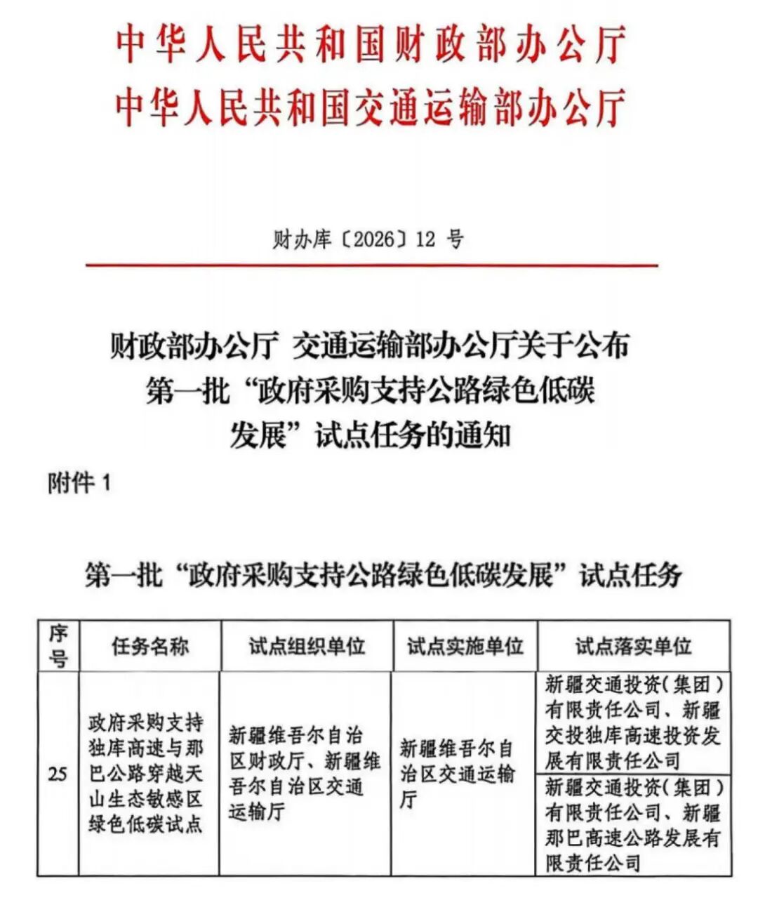 3月19日,财政部、交通运输部公布第一批“政府采购支持公路绿色低碳发展”国家级试点名单,在新疆交通运输厅的指导下,新疆交投独库高速投资发展有限责任公司(以下简称交投独库公司)申报的《政府采购支持独库高速与那巴公路穿越天山生态敏感区绿色低碳试点》任务成功入选。