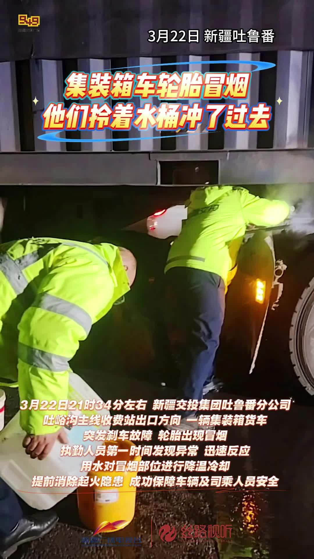 集装箱车轮胎冒烟,他们拎着水桶冲了过去